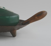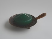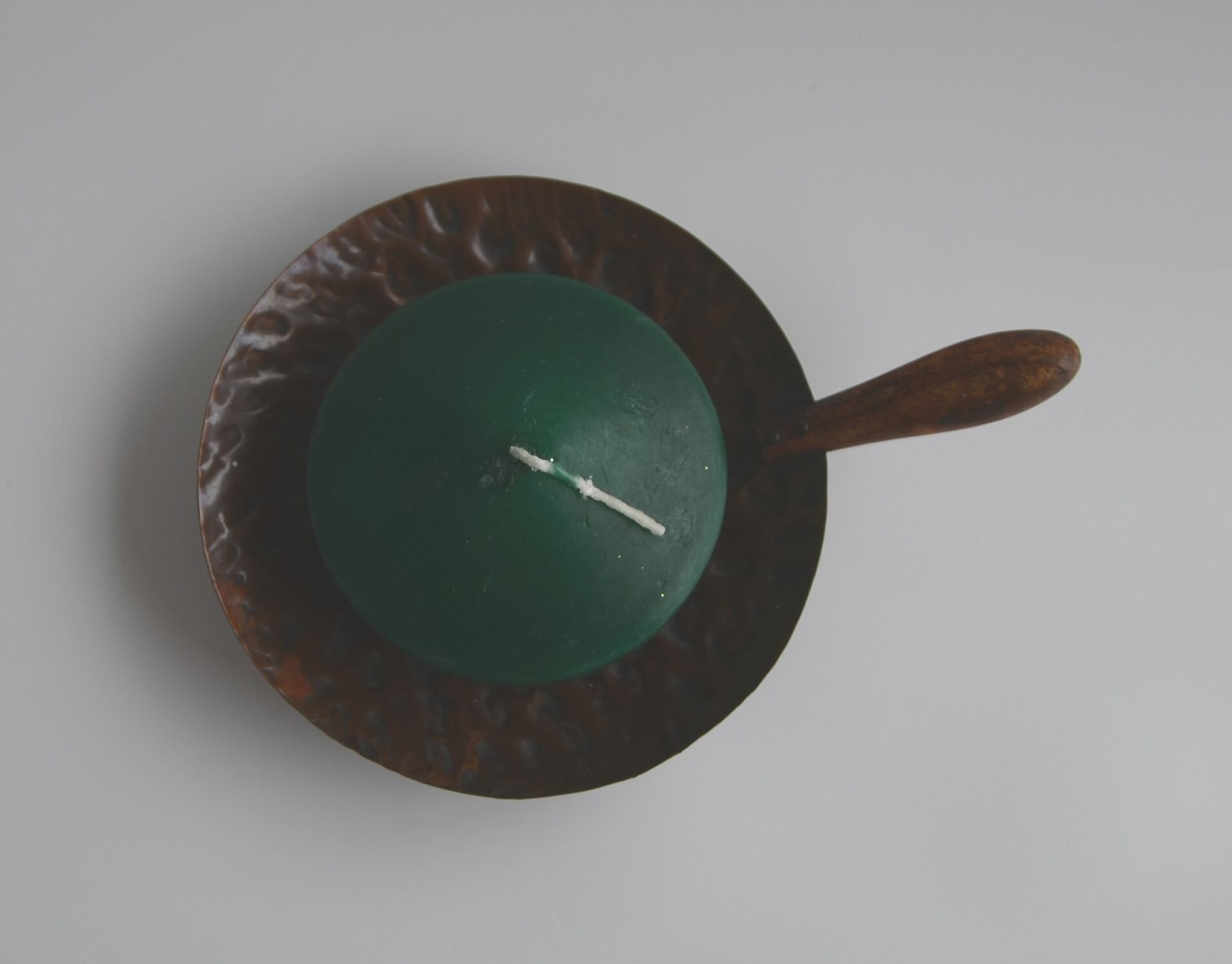 緑のろうそくが、そっと乗ったスタンド。叩いて広げられたコパのお皿がハンドメイドの温かみがあります。取手には木をセレクトしてあるところが更に作り手のセンスを感じますね。