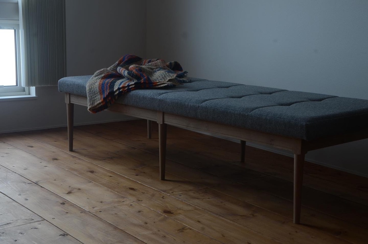 デンマーク製の肌触りの良いウール素材とナラ材のソープ仕上げの相性がとても良い、インテリアに溶け込むソファ・デイベッド。